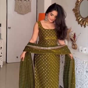 Elevate your style with the All-New 5000 Series 3-piece set! This elegant ensemble features a Japan satin Anarkali top with intricate thread and sequin work, a comfortable micro cotton pant, and a beautiful butterfly net dupatta. Perfect for festive occasions like Diwali, Karwachauth, Navratri, and Garba, this ready-to-wear outfit offers a custom fit and timeless charm. Keywords: Anarkali, Georgette, Lehenga, Pant, Sequins, Dupatta, Palazzo, Jacquard, Faux.