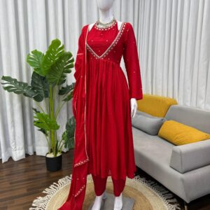 Discover effortless charm with our exclusive 3-piece Anarkali set, designed for comfort and stitched with grace. This ready-to-wear ensemble features faux georgette fabric, soft micro cotton lining, and intricate thread and sequin work. Available in sizes M to XXL with a 3XL margin, this outfit is perfect for festive occasions. The set includes a 52-inch Anarkali, micro cotton pants, and a 2.2-meter dupatta, all adorned with delicate detailing.