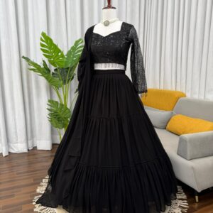 Elevate your ethnic wardrobe with our exquisite Designer Gown Set. This elegant ensemble, crafted from premium Faux Georgette, features intricate handwork with LCD and stone detailing. The set includes a beautifully designed gown with a comfortable inner lining, a matching Micro Cotton pant, and a Faux Georgette dupatta adorned with fancy lace and stone work. Perfect for festive celebrations, weddings, and special occasions, this ready-to-wear outfit combines modern style with traditional charm. Available in multiple sizes, ensuring a perfect fit for everyone. Keywords: Diwali, Karwachauth, Navratri, Garba, Faux Georgette, Ready to wear, Lehenga, Pant, Sequins, Dupatta, Palazzo, Jacquard.