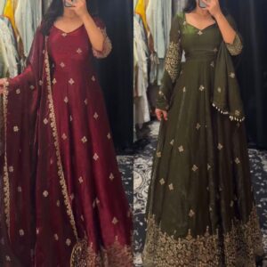 Elevate your style with the All-New 5000 Series 3-piece set (Style Code: 5953). This elegant ensemble features a Fendy silk Anarkali with intricate thread and sequin work, a soft Micro Cotton lining, and comes in sizes M to XXL (with a 3XL margin). The set includes a comfortable Micro cotton pant, fully stitched up to size 44, and a matching Fendy silk Dupatta with a 4-side border. Perfect for weddings, Haldi, Mehendi, receptions, cocktail parties, and any festive or formal occasion. Keywords: Faux, Georgette, Ready to wear, Lehenga, Pant, Sequins, Dupatta, Palazzo, Jacquard.
