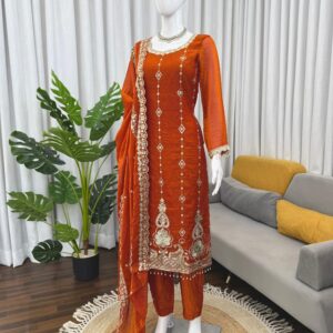 Elevate your style with the All-New 5000 Series 3-piece set (Style Code: 5953). This elegant ensemble features a Fendy silk Anarkali with intricate thread and sequin work, a soft Micro Cotton lining, and comes in sizes M to XXL (with a 3XL margin). The set includes a comfortable Micro cotton pant, fully stitched up to size 44, and a matching Fendy silk Dupatta with a 4-side border. Perfect for weddings, Haldi, Mehendi, receptions, cocktail parties, and any festive or formal occasion. Keywords: Faux, Georgette, Ready to wear, Lehenga, Pant, Sequins, Dupatta, Palazzo, Jacquard.