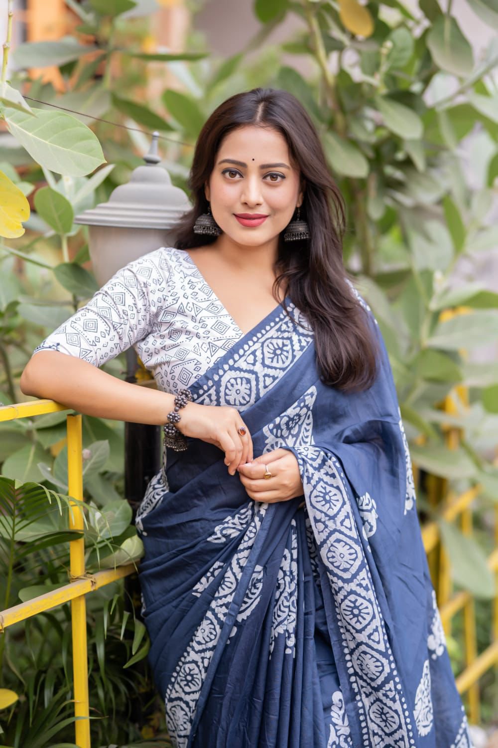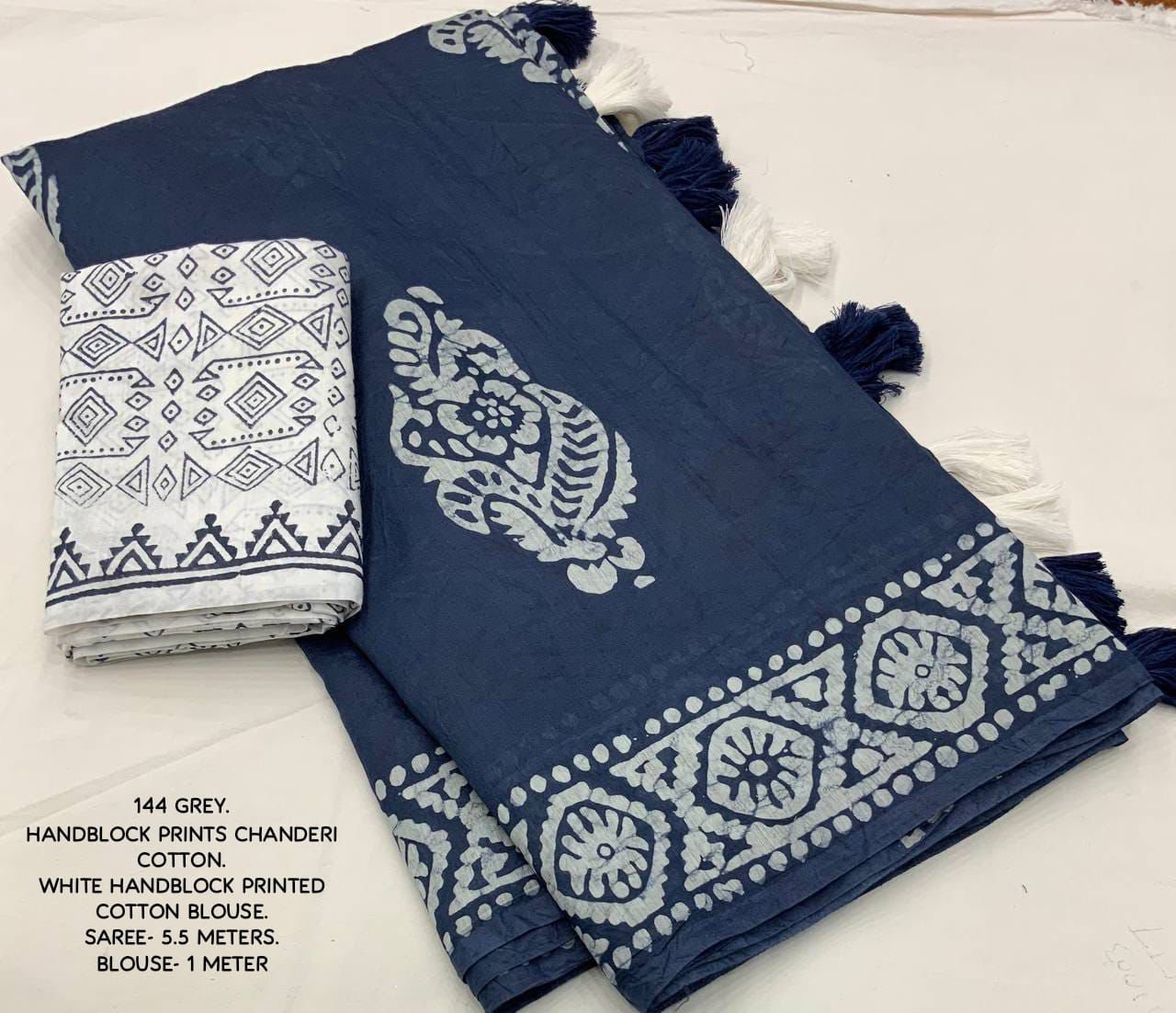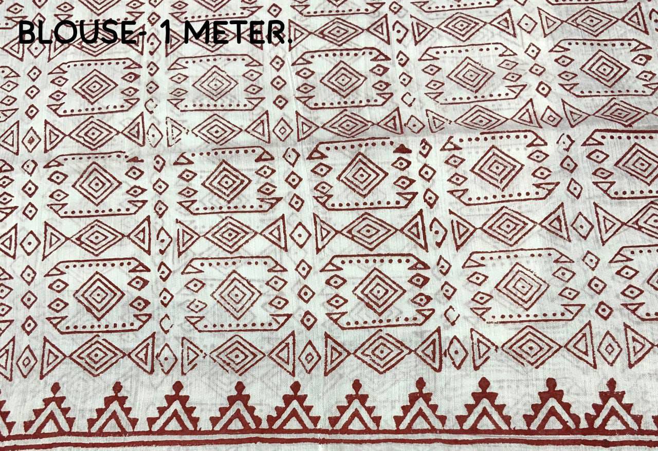 Blouse- white chanderi cotton with saree matched block print designs.