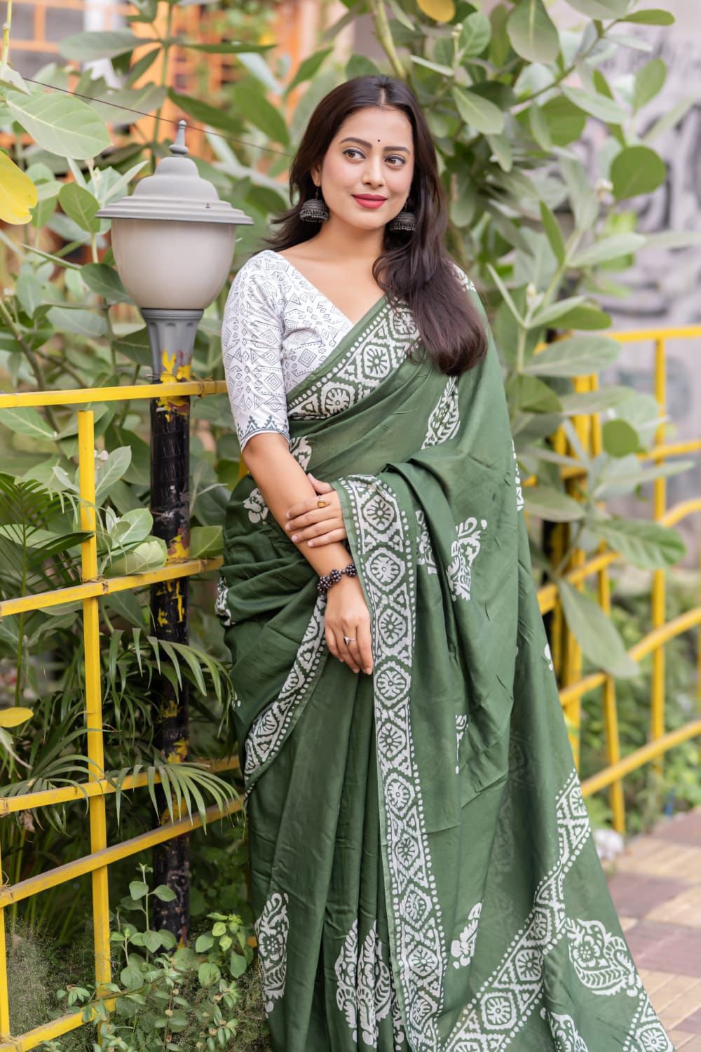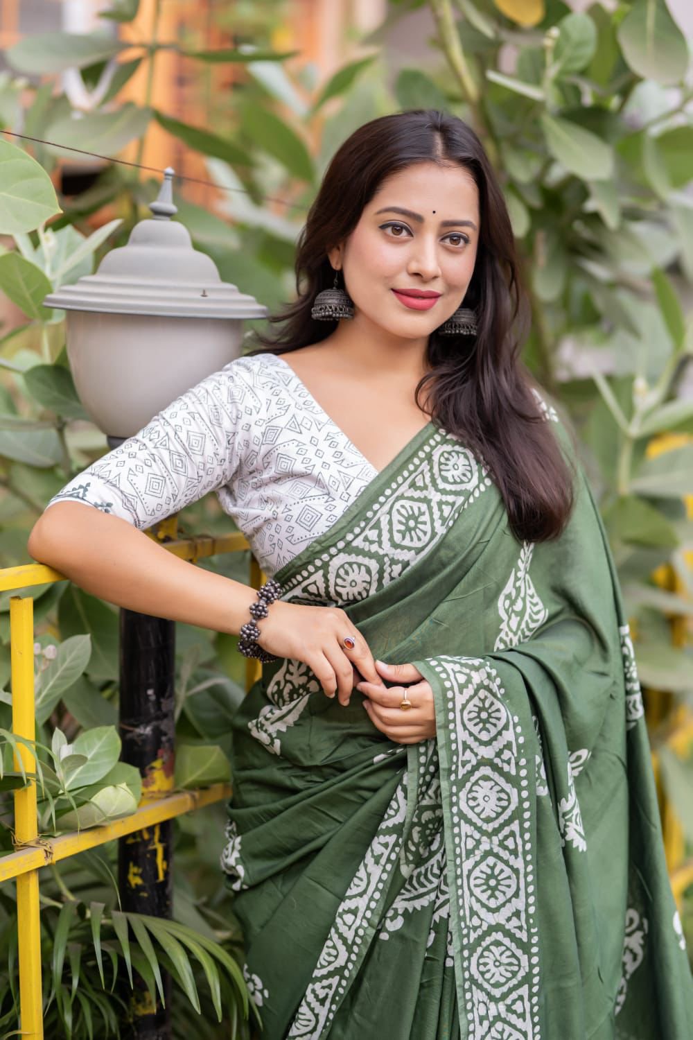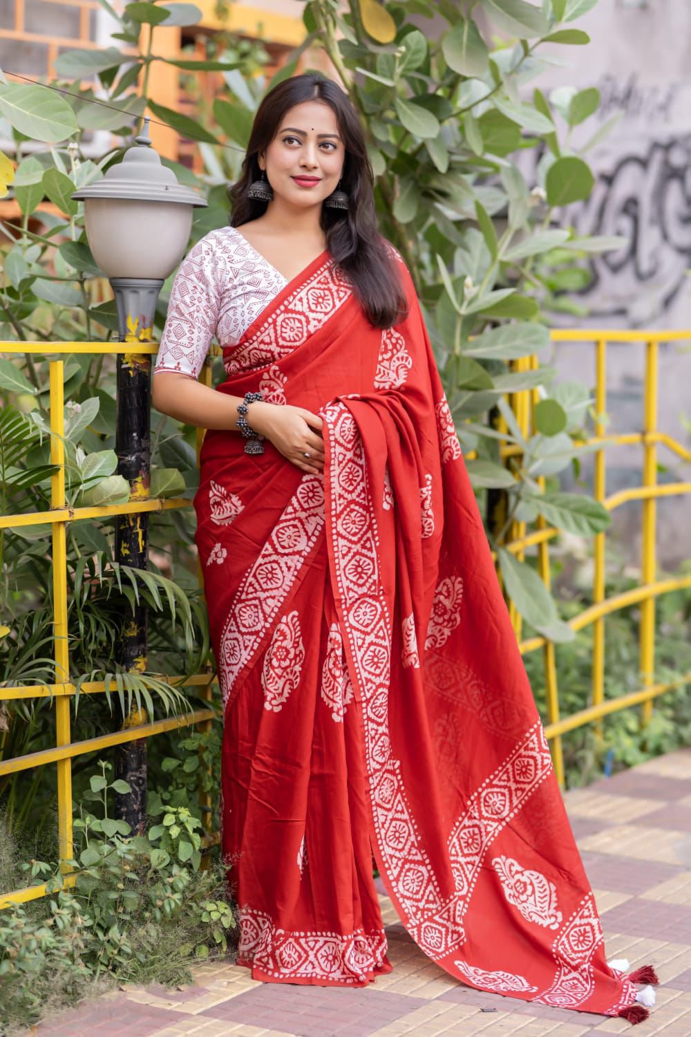 Blouse- white chanderi cotton with saree matched block print designs.